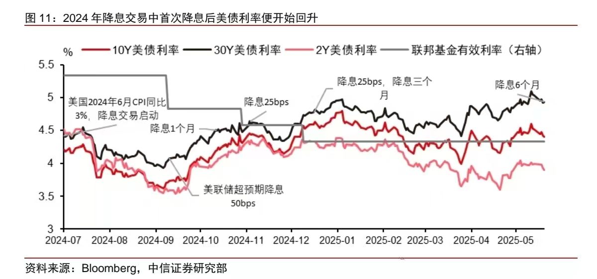 今年1月以来,“DeepSeek 时刻”+“Trump Recession”+“对等关税”后的“美国例外论”衰落一系列市场交易叙事使得美元指数从高位快速回落。进入7月以后美元指数下行速率放缓,且在鲍威尔在Jackson Hole鸽派发言后,美元指数仅小幅下行,参与降息交易程度不及美债。中信证券预计,在本轮降息交易中美元可能维持当前弱势的状态。