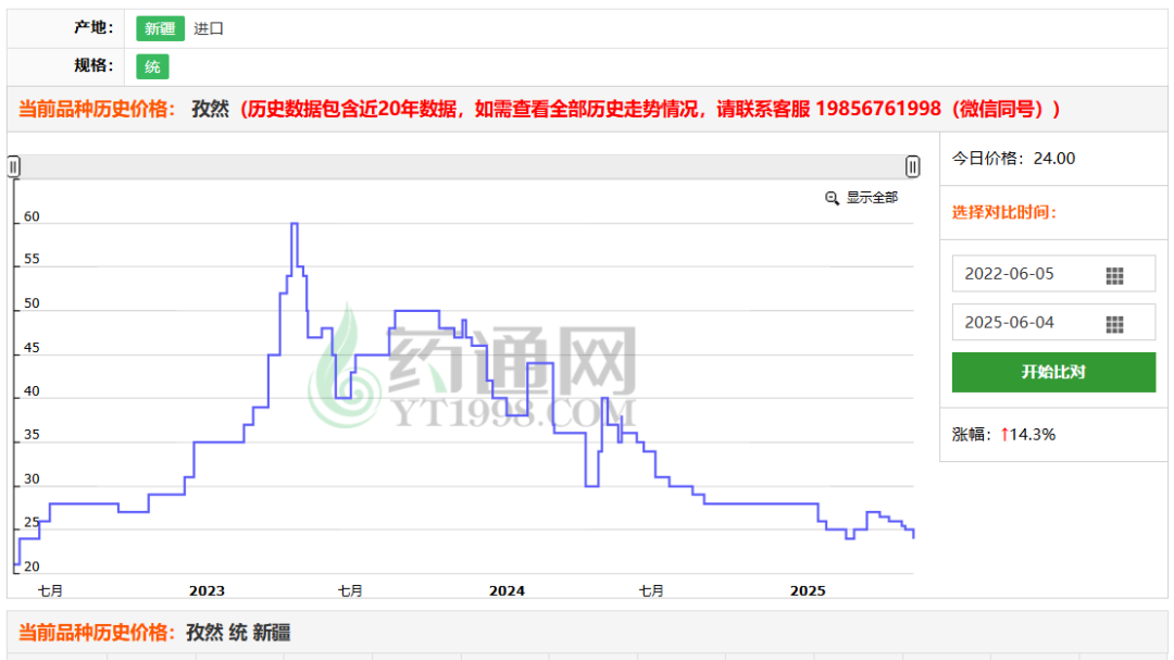 自2024年金银花价格一直稳步下滑,目前市场价格已从去年的145元(山东产统)落至90元。 金银花是我国传统的常用中药材,具有清热解毒的功效,因抑菌谱广、疗效显著而大量应用于中医临床、中成药生产和出口。 金银花主产于山东平邑、费县、日照、苍山、滕州;河南密县、巩县、荥阳、原阳、封丘、濮阳。金银花产区较集中,主要分布在山东平邑、河南封丘、河北巨鹿形成三足鼎立趋势,每年产量基本可满足大部分企业用量,一旦有新的需求或受灾减产利好,很容易触动涨价的按钮。 图示:金银花近三年历史价格 历史上金银花价格波动较频繁,2009年前价格长期在百元以内运行,2009年冬季受甲流疫情需求拉动,短时间内价格从100元飙升至200元以上,到年底涨至360元左右,2010年5月产新后价格回落至155-160元,随着产新结束价格又回升至200元上下。 2011年上半年金银花在180元左右徘徊,到冬季逐渐下滑至120元,年底跌至108元。由于金银花经历了近三年高价,药农多扩了种植面积,到2012年产量增加价格继续下滑至80-90元,产新时最低价跌至65元。2013-2017年上半年金银花价格在85-95元上下反复涨涨落落,低价影响了药农管理积极性,2017年新货产量显少,产新后价格逐渐回升至130元左右。2018年金银花从120-130元高升至200元左右,2019年在190元上下徘徊一年时间,2020年春因新冠疫情需求增加,短时间内涨至240元左右,而后,随市场需求恢复正常价格回落至160-170元。 2021年金银花产量增加,产新后价格下滑至140元左右,2022年价格基本稳定在130-140元上下,年底疫情管控放开,市场需求增加,价格大幅上涨,短期内从130元涨至200元,高价持续到2023年春。随着新冠疫情得到有效控制,金银花需求回归正常,价格也从200元以上回落至145元左右,此价持续到2024年产新前。 受近几年金银花涨价刺激,药农加强老田块植株管理,也相应地扩大了种植面积,导致2021-2024年产量增加,致使价格逐渐走低。 一旦金银花价格低落,就不会有新的面积增加,药农也会放松管理,如果遇到自然灾害减产,仍会有涨价的机会到来。 金银花栽种后头三年产量低,亩产只有几十公斤,3-5年后进入盛产期,亩产100-120公斤,高者可达150公斤,八年后产量逐年下降,十年后植株老化,需更新换代。2010-2011年高价期间栽种的,到2020-2021年需挖掉重新栽种,2020-2021年栽种的2023年进入盛产期。也就是说,今后几年在无自然灾害的情况下,金银花产量不会小。 金银花具有清热解毒、温病发热,增强免疫等功效,主要用于抗流感药物配方,同时,保健品花茶市场需求量也不少。药用量大约8000吨,凉茶用量不少于4000吨,花茶及兽用量2000吨左右,总体市场年需求量约1.4万吨。 金银花有很好的发展前景,在中医临床应用上,清热解毒效果显著,为治疗感冒的常用大宗品种;在中成药工业生产中,是银翘解毒丸(片)、犀羚解毒丸(片)等多种传统中成药和银黄口服液、感冒退热冲剂等新品种、新剂型的重要原料;金银花又是消暑解热的佳品,用作清凉饮料;还可做食品添加剂、药物牙膏等日用工业品的原料。金银花是出口的重要商品,在东南亚一些国家和地区享有盛誉,国内外市场潜力很大。 目前金银花主产山东平邑、莒县,费县;河南封丘及河北巨鹿县。金银花正常年山东产区可产5500吨货源,河南及周边正产年产4000吨左右,河北产区正产年产4500吨。三大产区正产年总产量可达1.4万吨,加上新发展产区产量,年总产量有1.5万吨以上,正产年产量完全可以满足市场需求。凉茶用量不稳定,药用相对没有多大变化,但是,若有突发疫情会增加需求量。正常情况下,金银花供求基本平衡,一旦受灾减产利好,容易触动涨价的按钮。 — END —