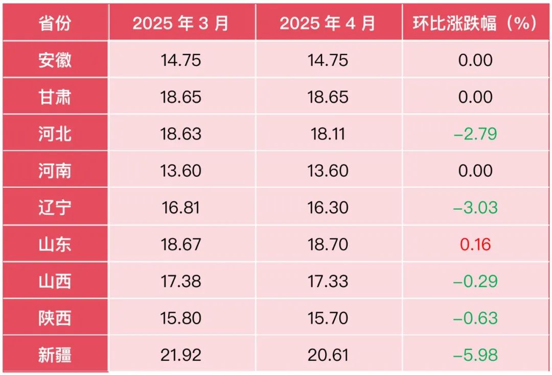 河北、辽宁、新疆等主产区价格回调幅度较大:其中,河北酸枣均价为18.11元/公斤,环比下跌2.79%;辽宁酸枣均价下跌3.03%;新疆酸枣均价跌幅最大,环比下跌5.98%。主因包括:①河北、新疆等地产区库存下降,但加工户因前期亏损减少生产,导致低价货源短缺而高价货滞销;②市场对2025年新产季种植面积扩大的预期增强,抑制价格上行。