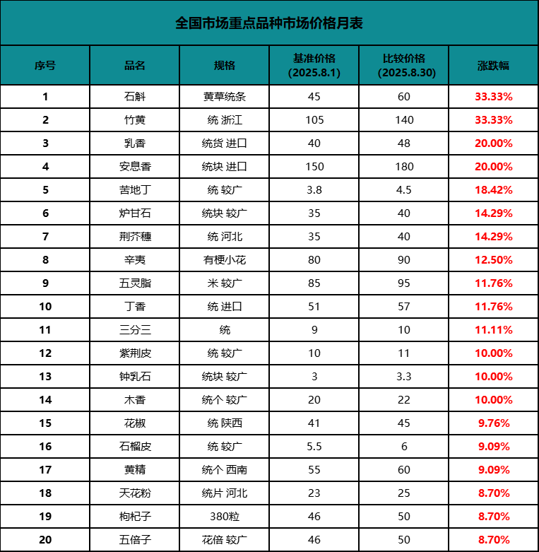 1. 产新压力集中释放:冬瓜子(-33.33%)、栀子(-25%)、海金沙(-24.14%)等正值产新,新货上市对市场形成明显冲击。2. 大宗品种需求疲软:酸枣仁(-25.53%)作为大宗品种的代表,价格从470元跌至350元,反映出去库存周期下的需求不足。甘草(-27.27%)、瓜蒌皮(-26.67%)等大宗品种同样面临类似困境。3. 小品种流动性危机:锦灯笼(-46.67%)、鸡骨香(-41.82%)等小品种由于市场关注度低,流动性不足,价格容易出现大幅波动。三、八月市场点评8月,全国各地高温持续,旱情加剧,影响中药材生长,引发业内对部分品种受灾减产的担忧;其次,本月多个中药材品种产新即降价,行业对产新药材关注度明显提高;第三,中药材价格的连续波动,已严重影响中药原料稳定供应,全产业链都在积极寻找解决途径;第四,多省中药集采不断推进,其落地效果以及原料稳定供给问题成为各方关注焦点。八月部分中药材行情变动概览:1、香料商家前期恐慌性抛售后,产地反弹国内行情同时提价 代表品种胡椒、豆蔻等,丁香产地价格上涨高于市场,带动市场行情上抬,但实际交易量不大;胡椒受越南产区行情上涨的影响,市场价格也跟随上走;白豆蔻产区涨价,市场商家要价也小幅度上扬。同时,广西遭遇干旱,部分挂果类品种减产明显,像八角等品种春果产新涨价,秋果减产,行情也出现不同程度反弹。在热门品种带动下香料热度提升,荜茇、小茴香等品种均出现不同程度反弹。2、药材品种表现乏善可陈 有前期行情跌到底部品种出现反弹的品种像太子参、猫爪草、薄荷等。典型品种牛蒡子,产新后行情走低,达到近年低点,随后出现反弹,市场毛货由9-9.5元升至目前的11元。还有像百合高位继续震荡走高的,产地产新继续,受高价刺激,今年种植户有种植积极性,多将鲜货留作种苗,导致新干品上市量减少。3. 产新下跌是主旋律,行情下跌或走疲品种: 白术、酸枣仁、天麻等部分提前采收对行情产生了冲击,价格较乱;黄连人气低落,随着产新的到来,行情继续回落;连翘今年有减产利好,但淡季订单量减少,价格不振;锁阳受新陈货叠加,行情延续低迷;党参、黄芪、甘草价格疲软,仅刚需规格按需走动。热点品种纷纷下跌,市场整体下行为主。因此,我平台建议,在未来防疫类品种、低价品种、进口香料类品种以及易受干旱影响的品种仍需密切留意,同时也要关注价格异动品种带来的风险。四、综上所述