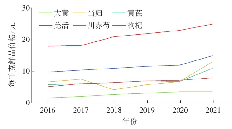 图2 青海省2016—2021年6种代表性中药材鲜品价格