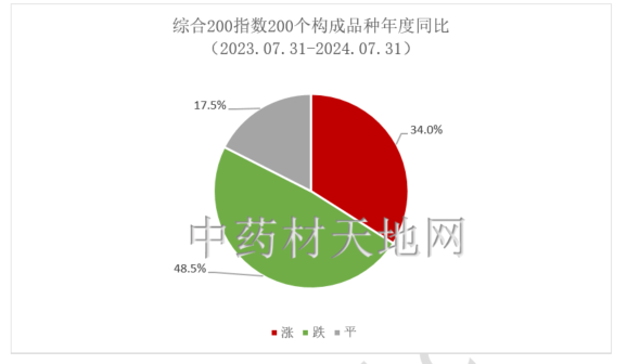 195个全草类品规2024年7月31日价同比2023年7月31日,升价品规19个,占总量9.7%;降价品规31个,占总量15.9%;平价品规145个,占本期品规总量约74.4%。
