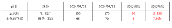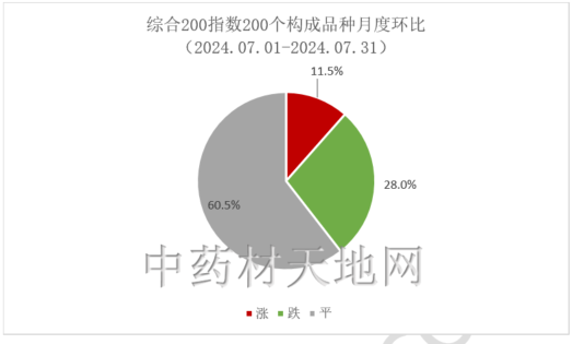 195个全草品规7月31日价环比7月1日,升价品规4个,占总量2.1%;降价品规5个,占总量2.6%;平价品规186个,占本期品规总量约95.3%。