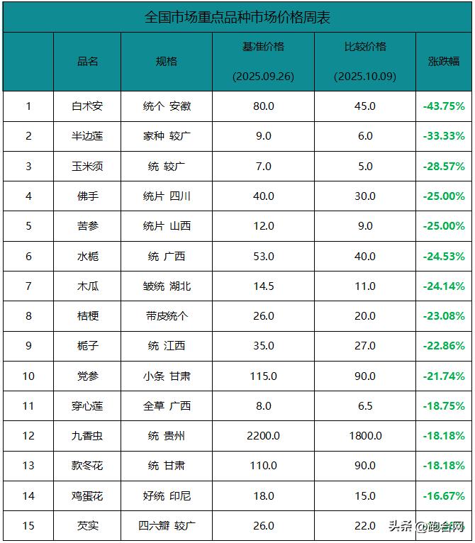 1、2025年10月第一周产新深入中药材行情下跌为主
