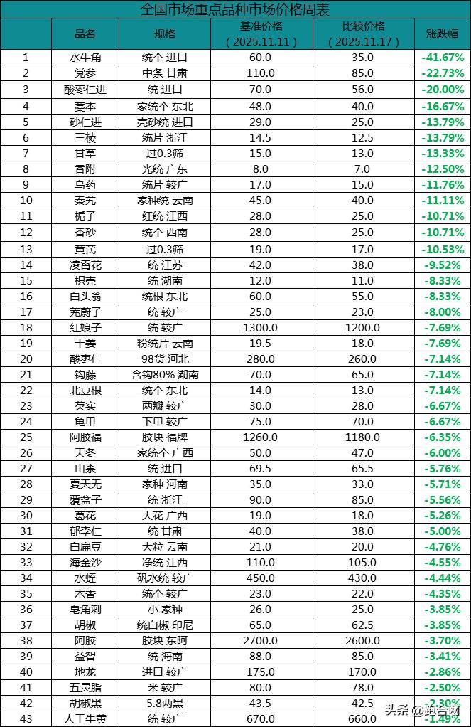 上周,中药材市场涨跌价品种数量双双下跌,市场传统旺季整体交易萎缩,大量产新货源等待缓慢消化中。