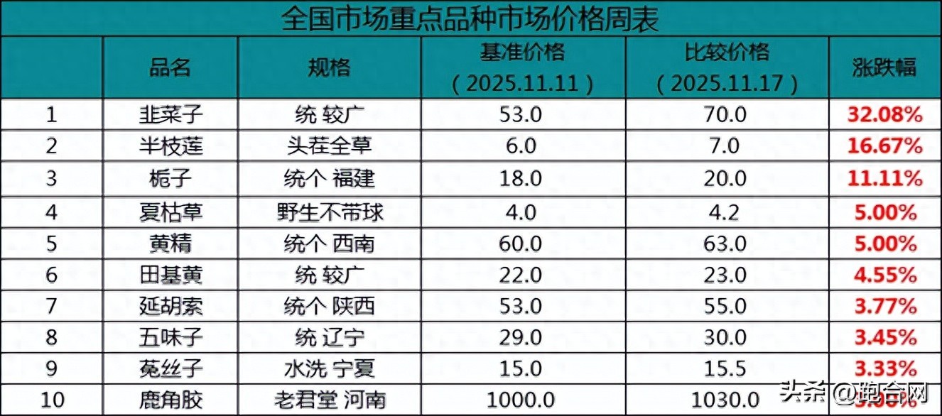 五味子:行情暂稳,整体走动一般。饮片货32-33元,统货30元,投料货28元。