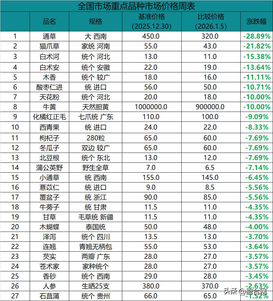 天花粉可供货源充足,新货上市量增多,走销顺畅,行情平稳。小统个16-19元,统片24-26元。