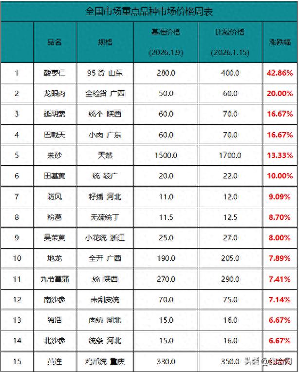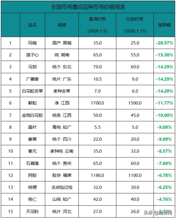 2026年01月09日-2026年01月15日,笔者对各大平台数据监控的870个品种中,本周上涨品种数27个,较上期增加5个;下跌品种数21个,与上期相比减少18个,其余品种价格与上周相比波动不大。
