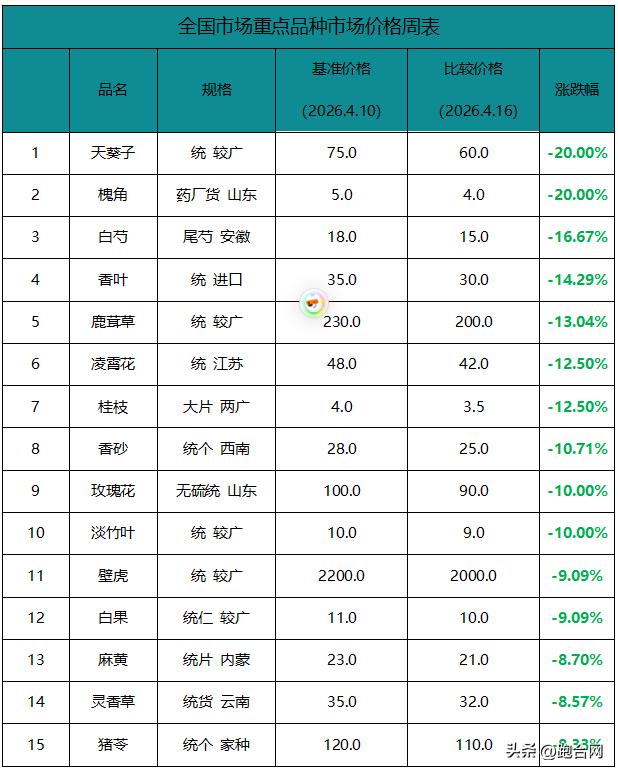 市场呈现“跌面显著扩大、上涨品种零星”的弱势格局。天浆壳、仙鹤草、土鳖虫等少数品种表现坚挺;而天葵子、白芍、香叶、玫瑰花等多数品种受产新或临新压力,价格普遍下滑。春季产新高峰期仍在持续,供应端压力全面释放,市场整体承压运行。